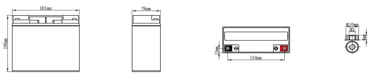 | 12V | 18AH | 182±2mm | 77±2mm | 166±2mm | 166±2mm | Approx 5.10kg (11.24lbs) | ≈17.6mΩ | T04 (standard) |
