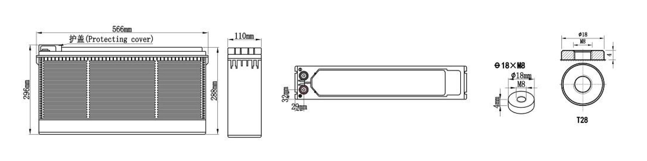| 12V | 150AH | 566±4mm | 110±2mm | 288±3mm | 296±3mm | Approx 44.0kg (97.0lbs) | ≈5.00mΩ | T28 (standard) |