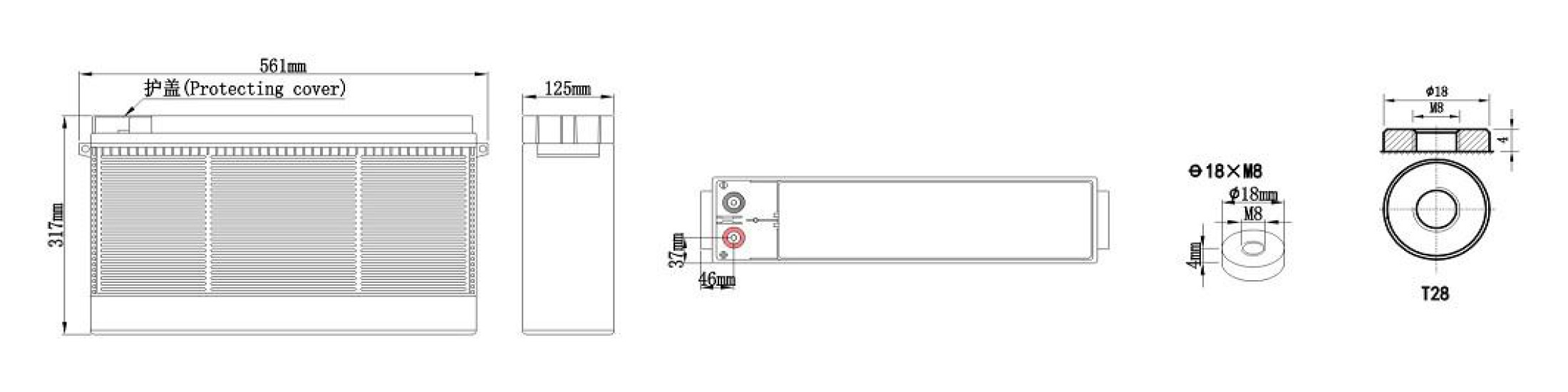 | 12V | 200AH | 561±4mm | 125±2mm | 317±3mm | 317±3mm | Approx 56.5kg (124.5lbs) | ≈3.70mΩ | T28 (standard) |